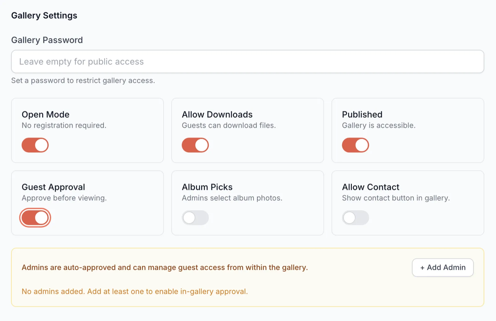 Make your client the gallery admin. They handle sharing with family and friends — you focus on your next shoot.