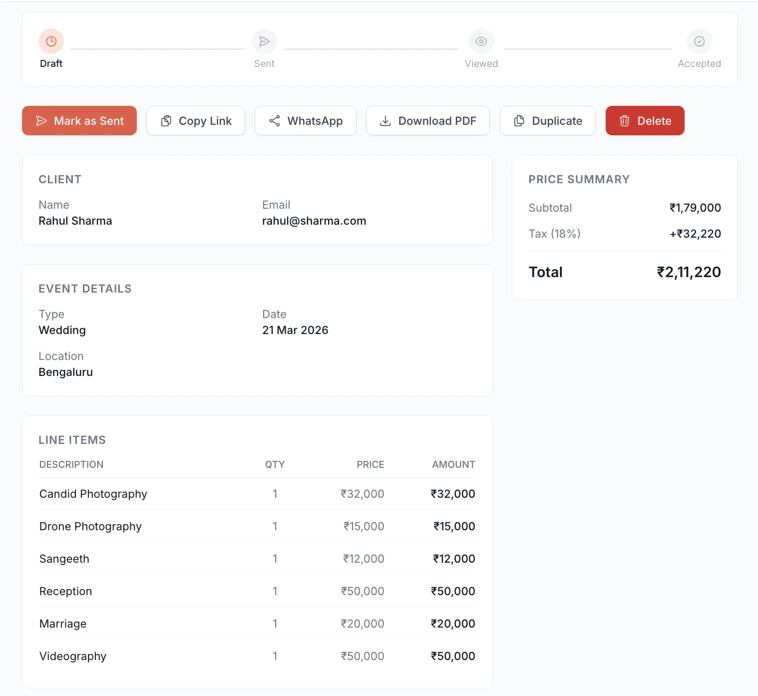 The traditional quoting process is a mess: manually writing down services in a notebook, creating ad-hoc Excel sheets, or using generic PDF templates. There's no standardized format, no easy way to share with clients, and no tracking. When a client calls months later about a remaining payment, you're digging through WhatsApp chats and paper files trying to remember what was agreed upon. Worse, the lack of professionalism in manual quotes often leads to photographers settling for less money.
